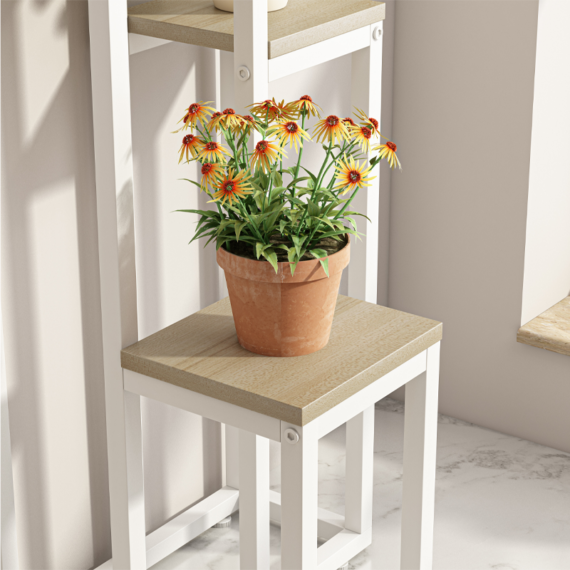 Hledáte elegantní způsob, jak vystavit rostliny v květináčích? Bílý stojan na květiny Loft je dokonalou kombinací moderního designu a funkčnosti. Vysoký stojan na květiny z odolného kovu a MDF v odstínu přírodního dřeva se bude skvěle hodit do loftových, skandinávských nebo moderních stylových aranžmá.