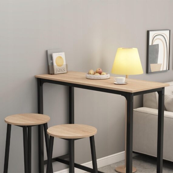 Stylový a funkční barový set v barvě světle hnědé je perfektním řešením do kuchyně, jídelny nebo obývacího pokoje. Kombinuje teplý odstín dřeva s černým kovovým rámem a vytváří tak módní loftový vzhled, který se hodí do každého moderního interiéru.