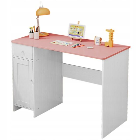 Bílý psací stůl se zásuvkou a skříňkou – pro dívky, růžová deska, loft, 110 cm