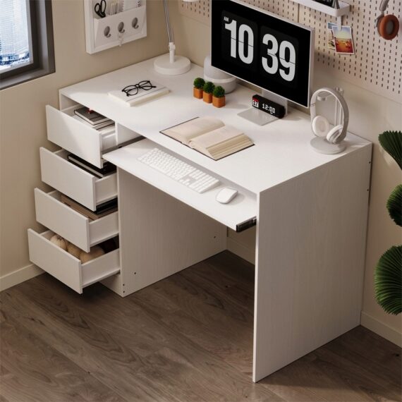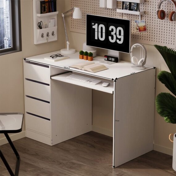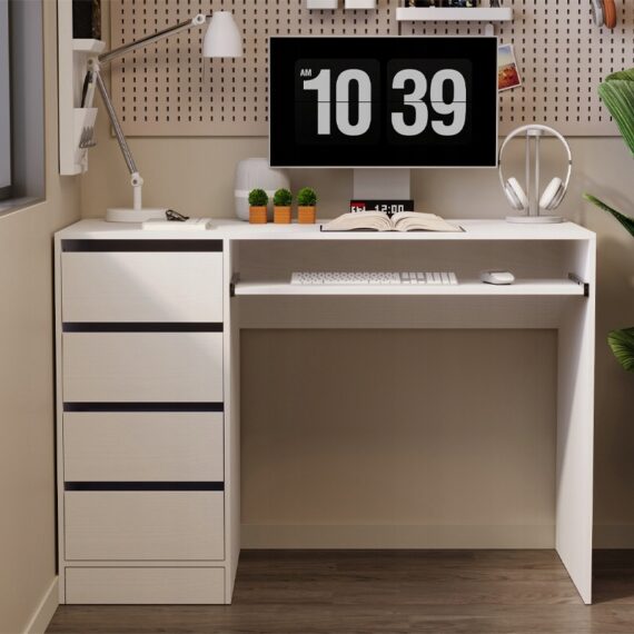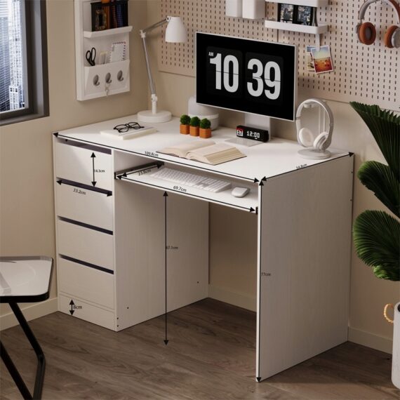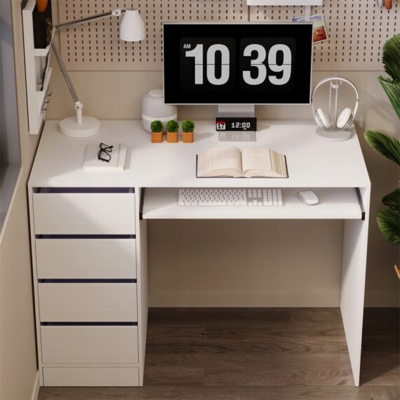 Bílý počítačový stůl pro mládež – moderní, se zásuvkami a policí