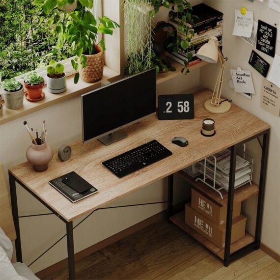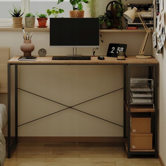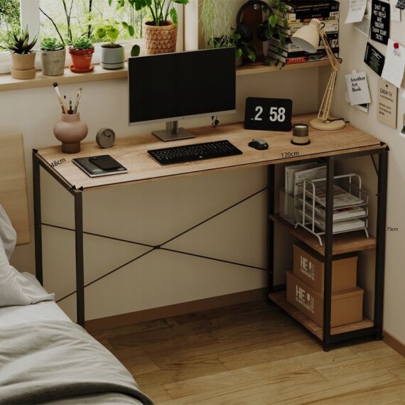 Počítačový stůl loft – světle hnědý, moderní, s policemi – industriální