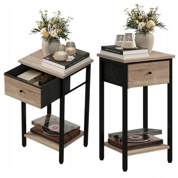 Funkční a stylový noční stolek v industriálním stylu je praktickým doplňkem ložnice, obývacího pokoje nebo kanceláře. Kombinace světle hnědé desky s kovovou konstrukcí dodává nábytku moderní loftový charakter a díky kompaktním rozměrům se skvěle hodí i do menších prostor.