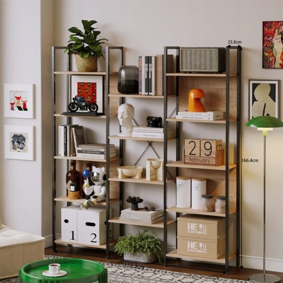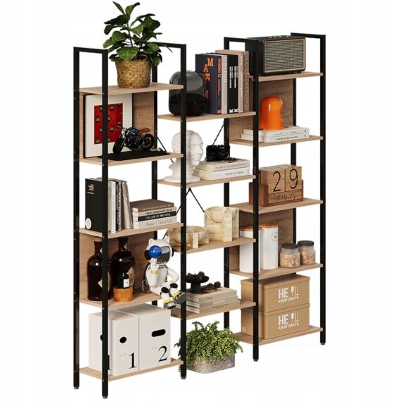 Moderní regál ve stylu loft/industrial je ideálním spojením funkčnosti a designu. Konstrukce typu žebřík s otevřenými policemi se skvěle hodí jako regál na knihy, dekorace, rostliny nebo kancelářské doplňky. Světle hnědá deska v kombinaci s kovovým rámem dodává interiéru charakter a lehkost.