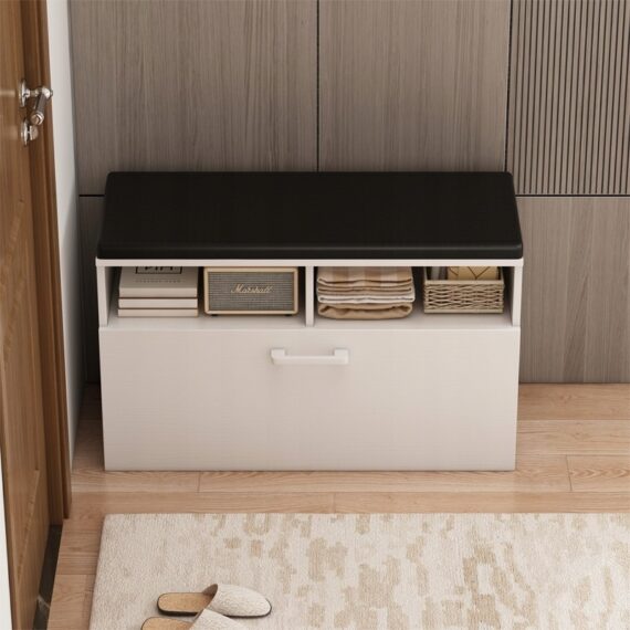 Hledáte praktický kus nábytku do předsíně? Náš bílý botník se sedátkem a otevíracím úložným prostorem je dokonalým řešením pro uspořádání bot a doplňků!