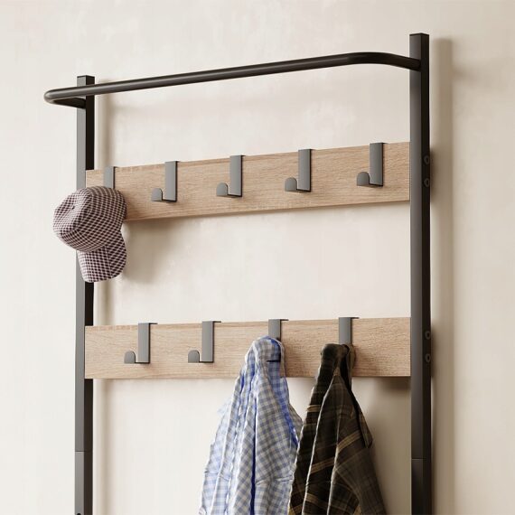 Ideální do předsíně, ložnice, šatny nebo kanceláře – věšák se hodí všude tam, kde je potřeba funkční prostor pro uložení oblečení a obuvi.