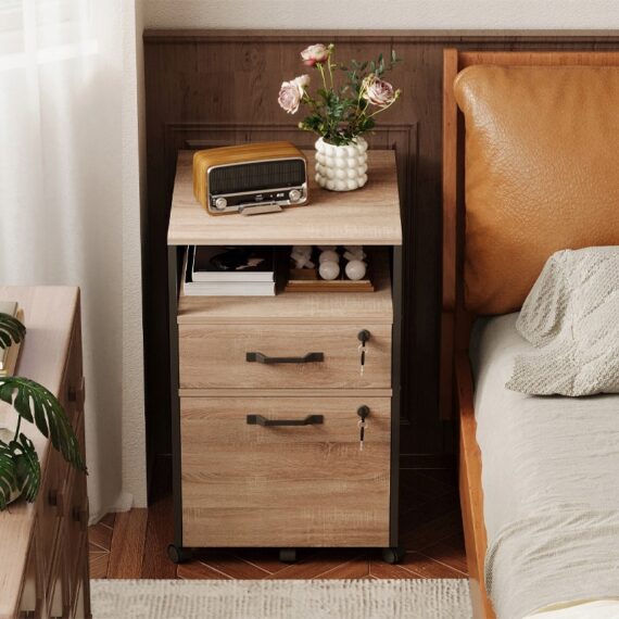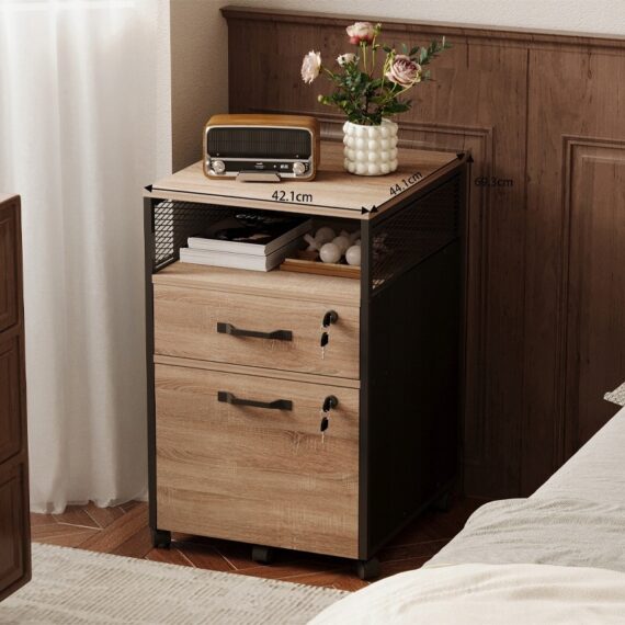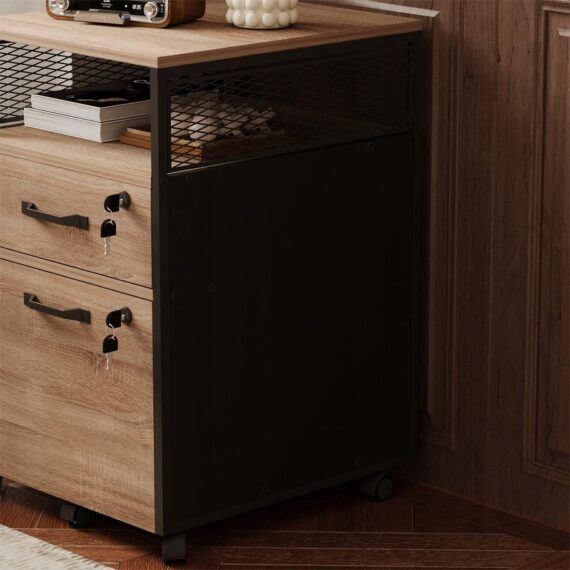 Funkční skříňka na kolečkách v barvě světle hnědé je praktický a stylový kus nábytku do kanceláře, pracovny nebo ložnice. Skvěle se hodí jako kontejner na dokumenty, pomocník u psacího stolu nebo noční stolek. Kombinace světle hnědé desky s černou kovovou konstrukcí dodává celku moderní loftový charakter.