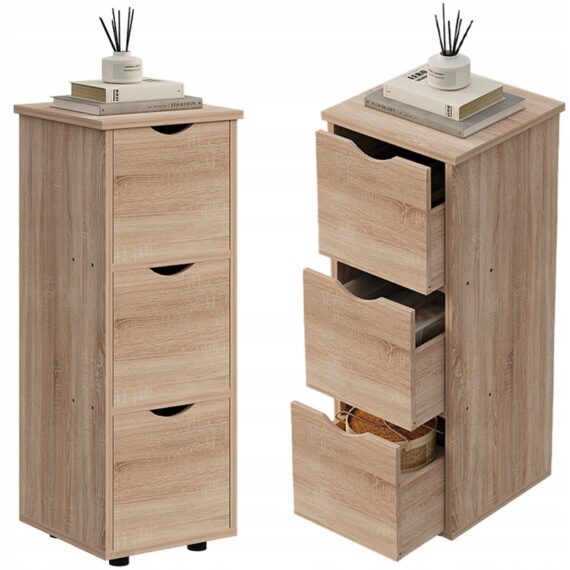 Stylová a funkční skříňka v barvě rustikálního dubu je ideálním řešením do obývacího pokoje, ložnice, koupelny nebo předsíně. Úzká konstrukce umožňuje umístit nábytek i do omezeného prostoru a prostorné zásuvky zajišťují pohodlné skladování.