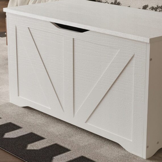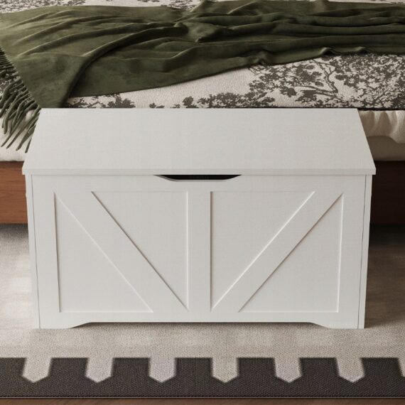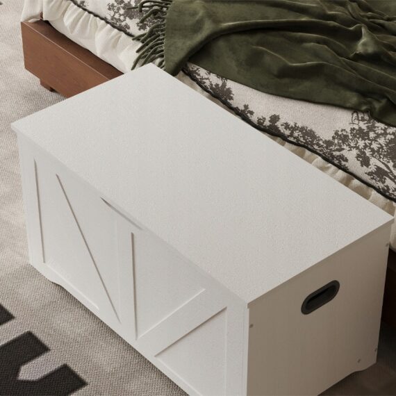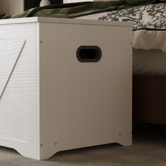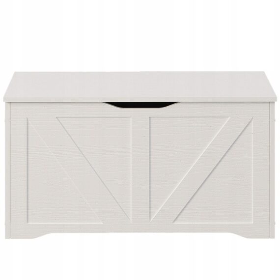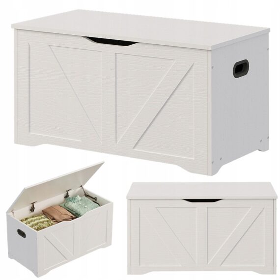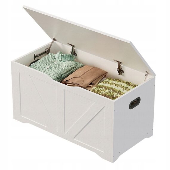 Tato prostorná a stylová bílá dřevěná truhla je praktickým řešením pro uložení ložního prádla, dek, polštářů a dalších bytových textilií. Díky minimalistickému designu v loftovém stylu se skvěle hodí do ložnice, obývacího pokoje nebo chodby a kombinuje funkčnost s estetikou.