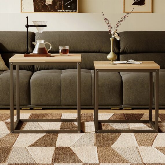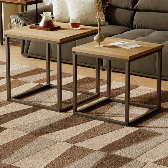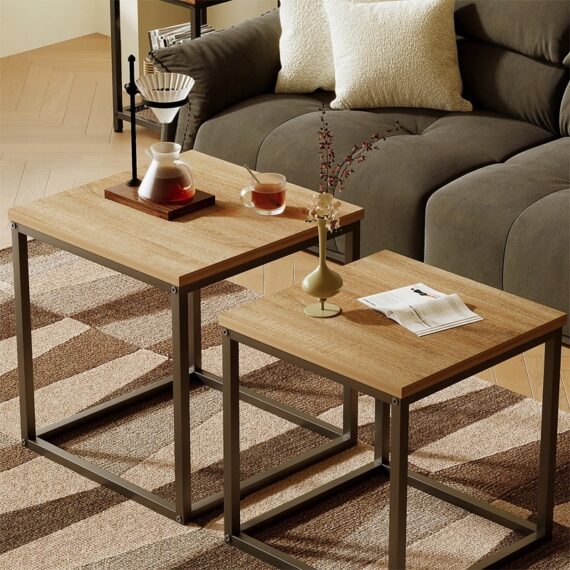 Moderní sada stolků 2v1 ve stylu loft/industrial je praktickým a stylovým řešením do obývacího pokoje. Díky možnosti zasunutí jednoho stolku pod druhý umožňuje sada flexibilně přizpůsobit prostor aktuálním potřebám – jako konferenční stolek, lavice nebo přídavná odkládací plocha. Barva světle hnědá v kombinaci s kovovou konstrukcí dodává interiéru charakter.