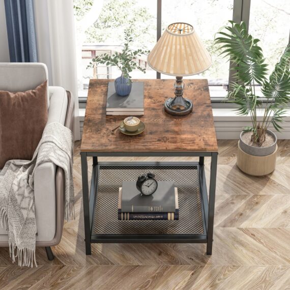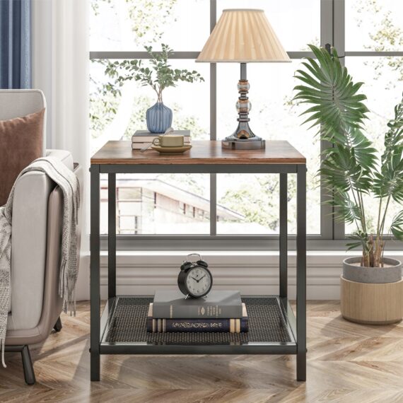 Kovový rám zajišťuje stabilitu, zatímco dřevěná deska a police dodávají přírodní nádech.