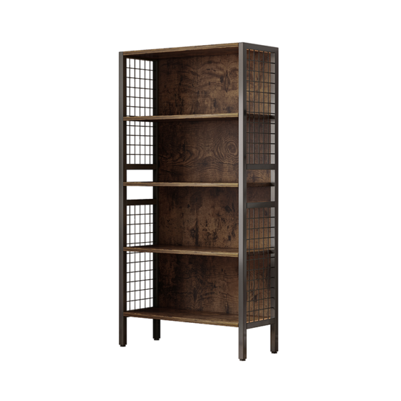 Knihovna zaujme teplým odstínem starého dřeva (vyrobeného z odolné MDF), který dokonale kontrastuje s matným černým kovovým rámem. Boční prvky ze síťoviny dodávají regálu syrový, industriální nádech a zároveň zajišťují stabilitu konstrukce. Promyšlená funkčnost: